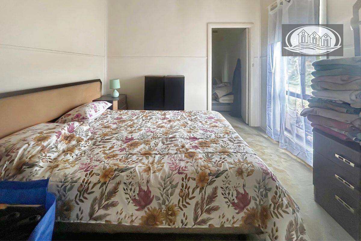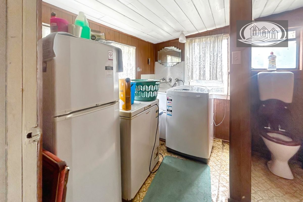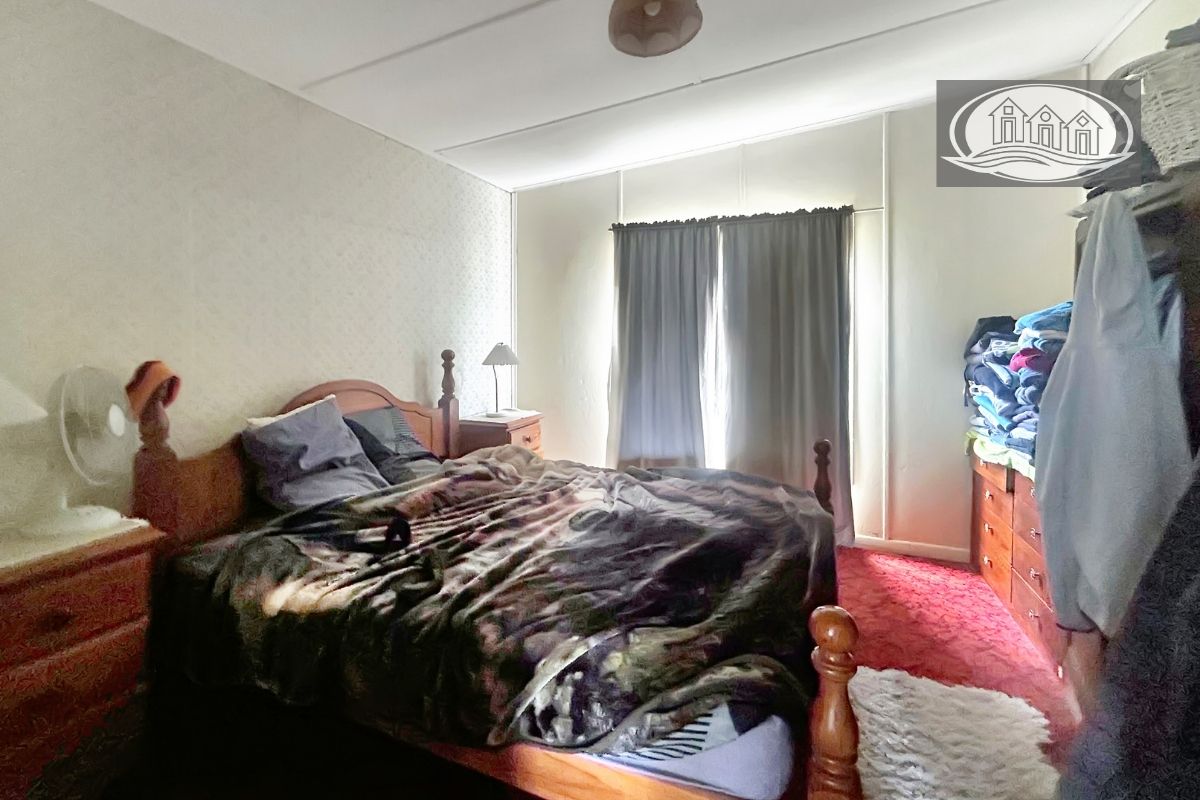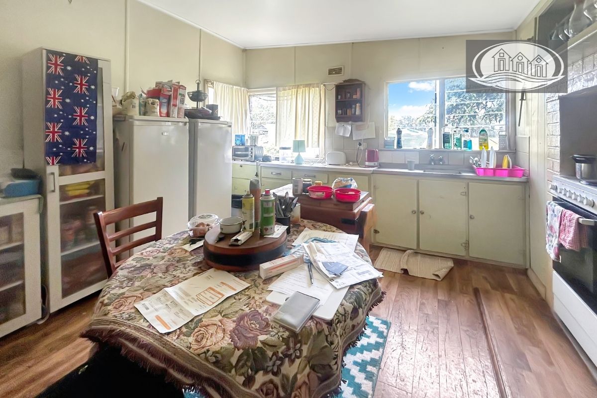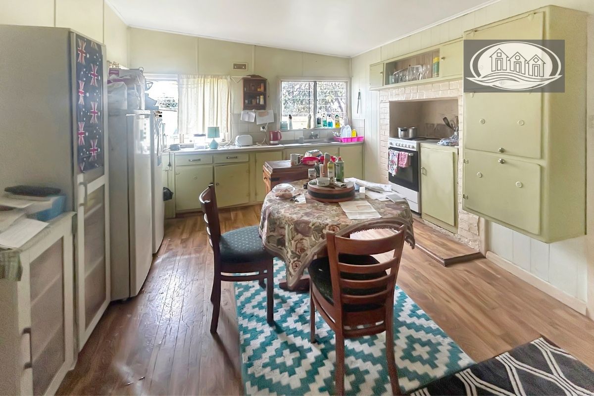 The four-bedroom home is of an older style, neat and comfortable, offering solid bones and scope for renovation or personal touches. A central kitchen with electric cooking connects to the living area, where a wood heater provides warmth and character. The bathroom includes both shower and bath, with a separate toilet for convenience.