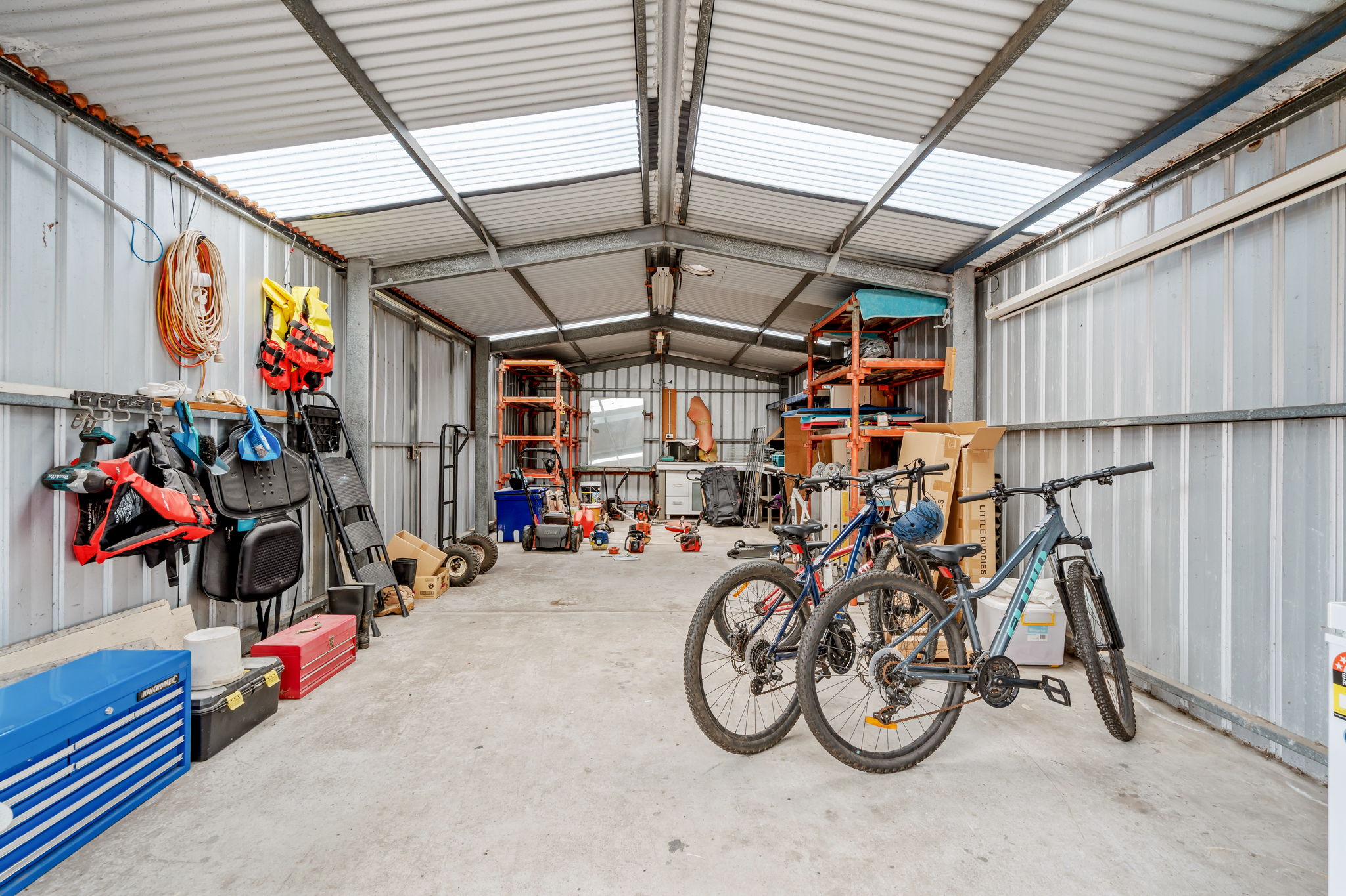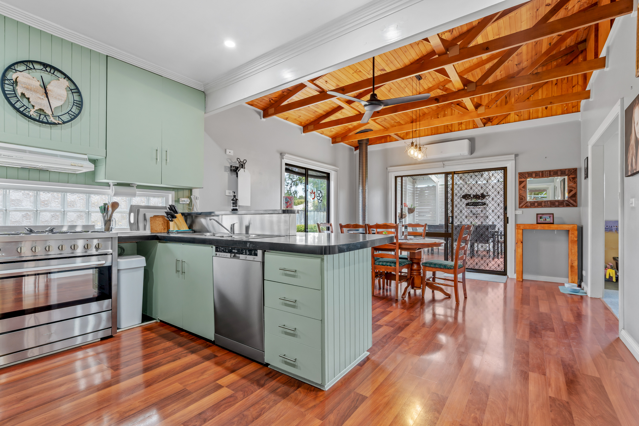 At the heart of the home is the open-plan kitchen and dining area, featuring rich Jarrah floating floors, cosy wood-fire heating and year-round comfort with reverse-cycle air-conditioning. Soaring cathedral ceilings with exposed beams flood the space with natural light and create an impressive potential for a second living zone ideal for relaxing or entertaining.