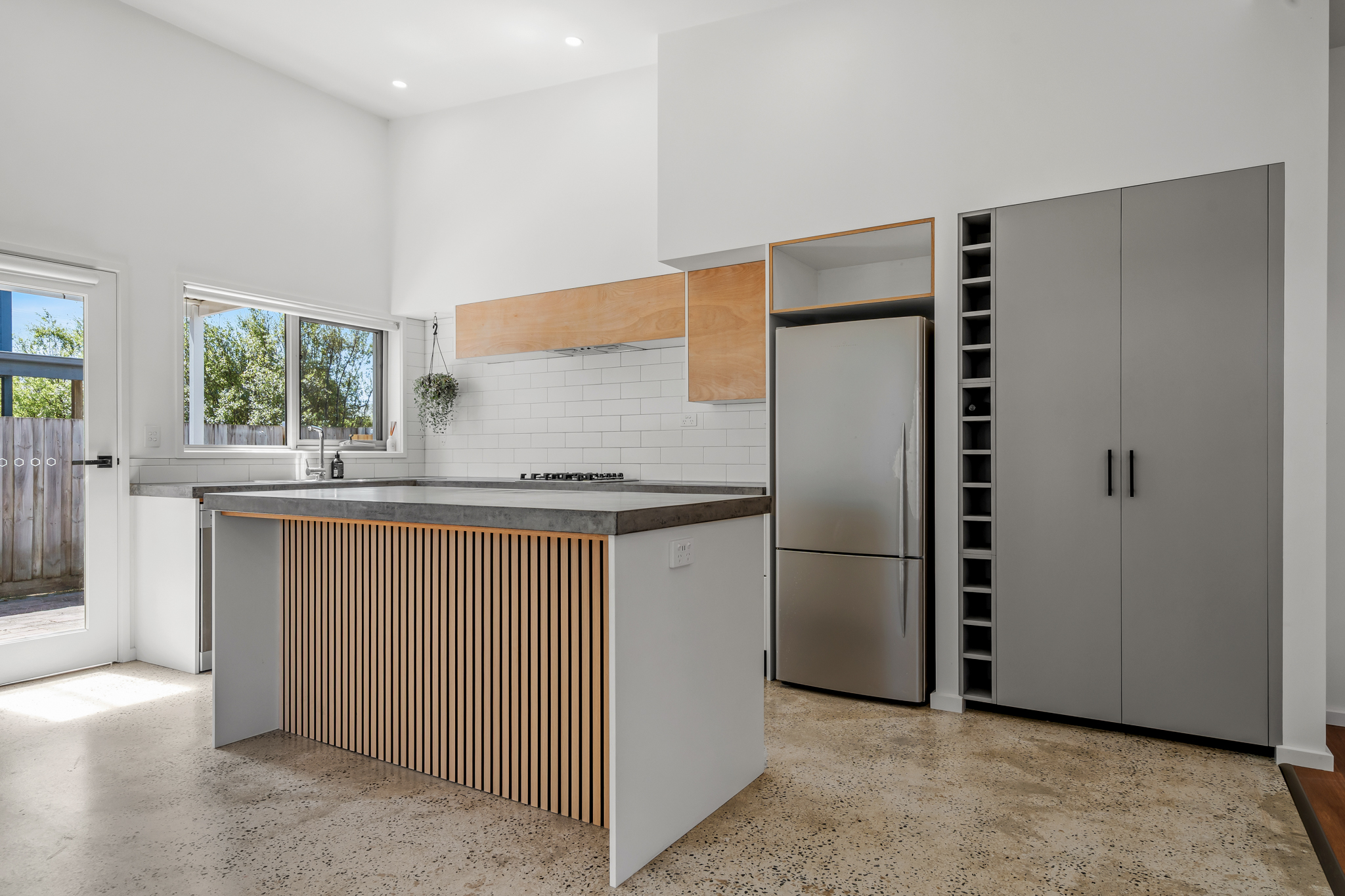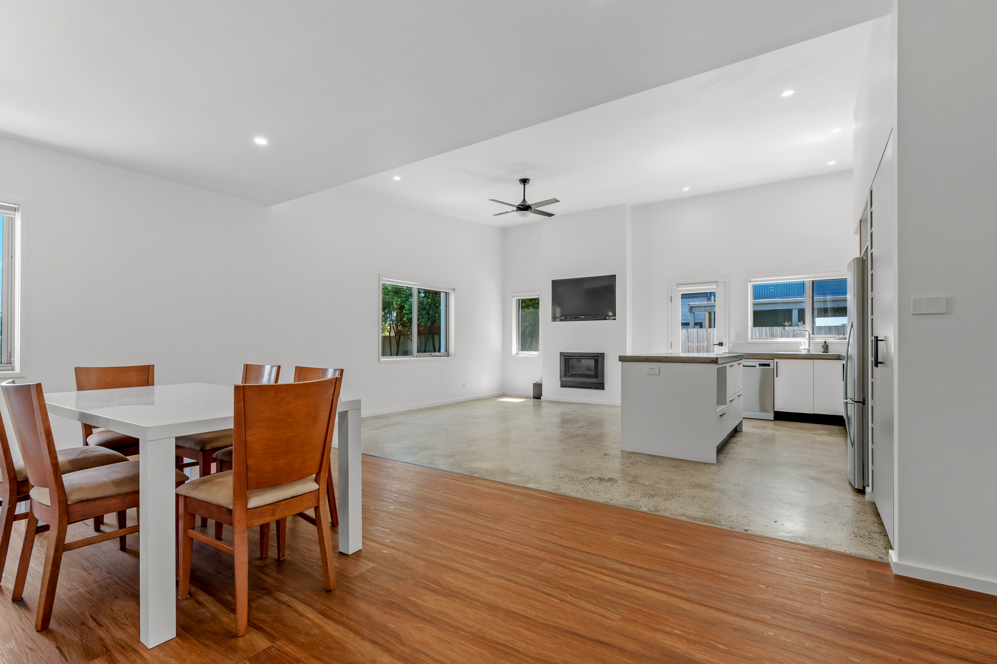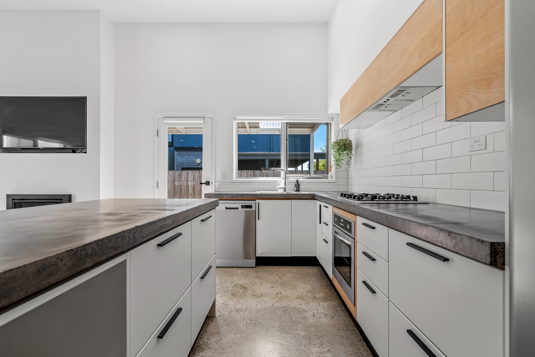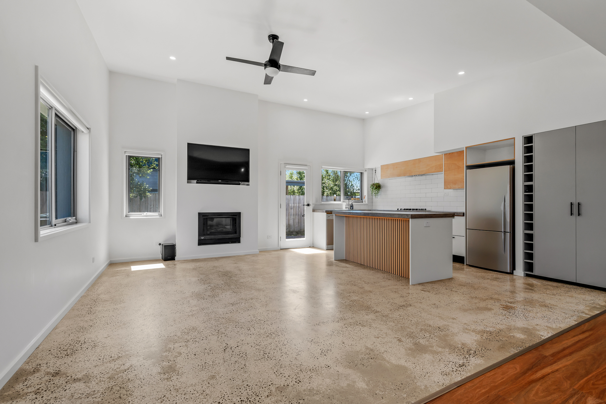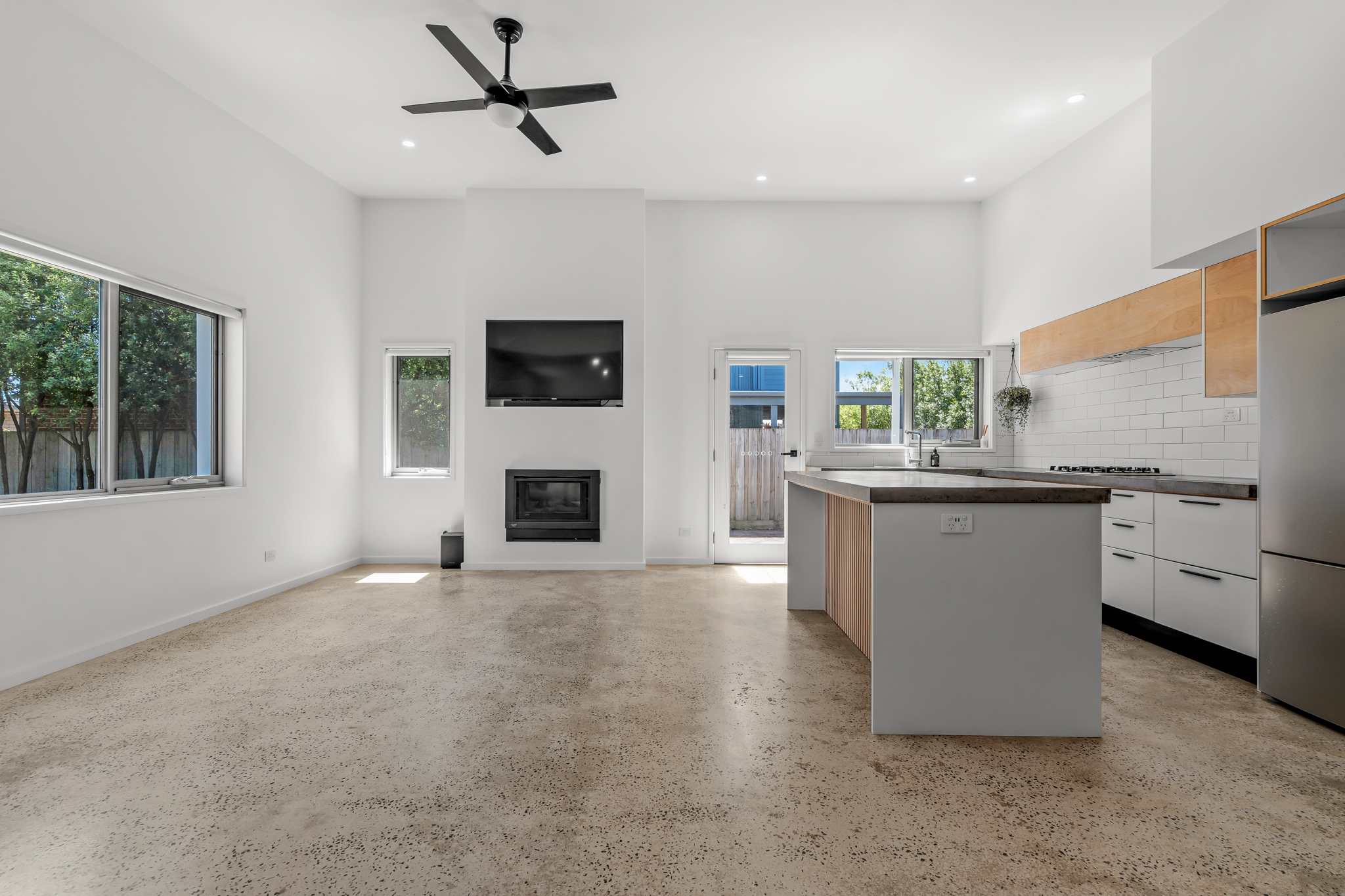 Designer Interiors: Polished concrete floors, gas log fire, and a high-end kitchen with a large island bench.