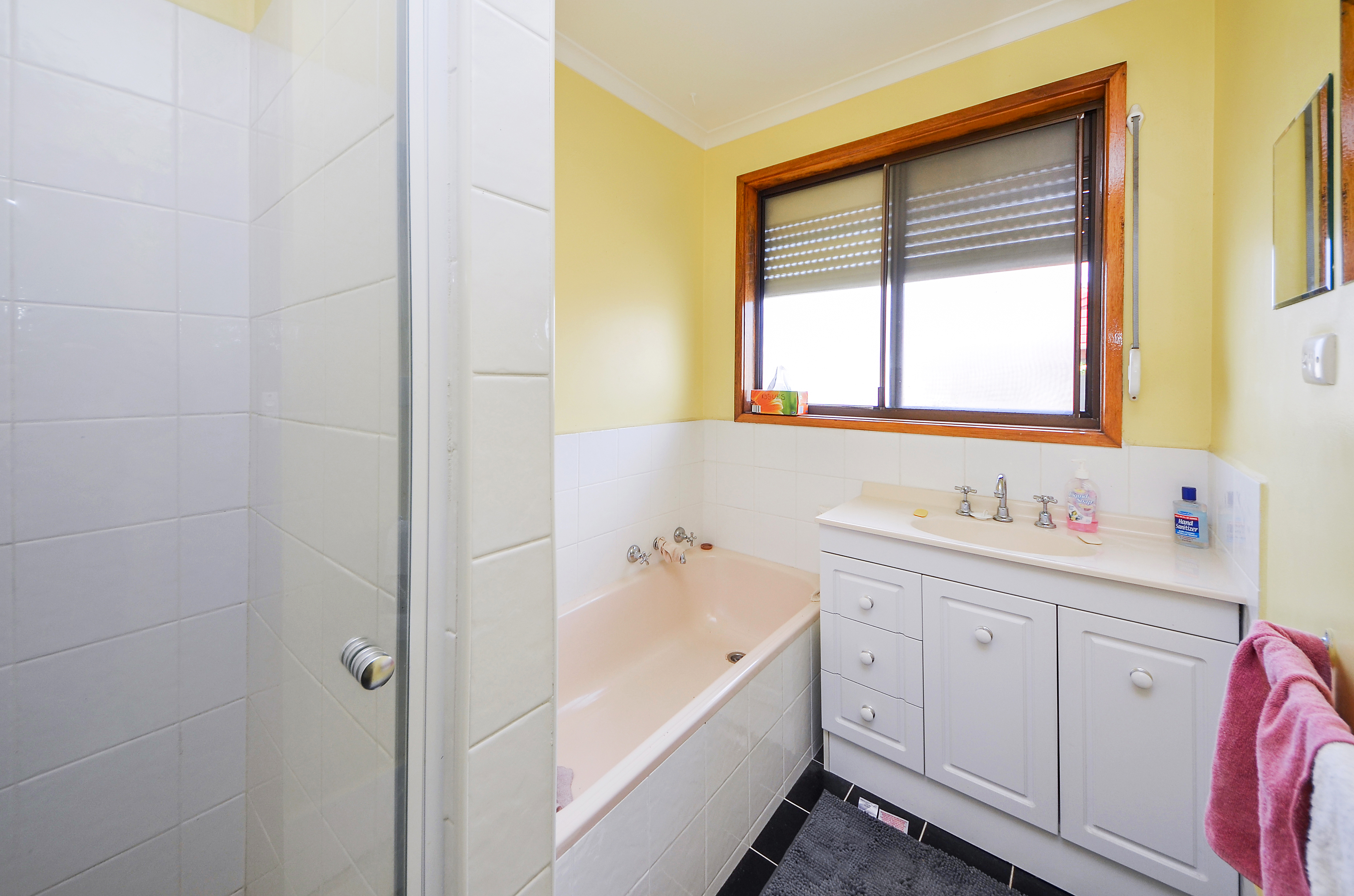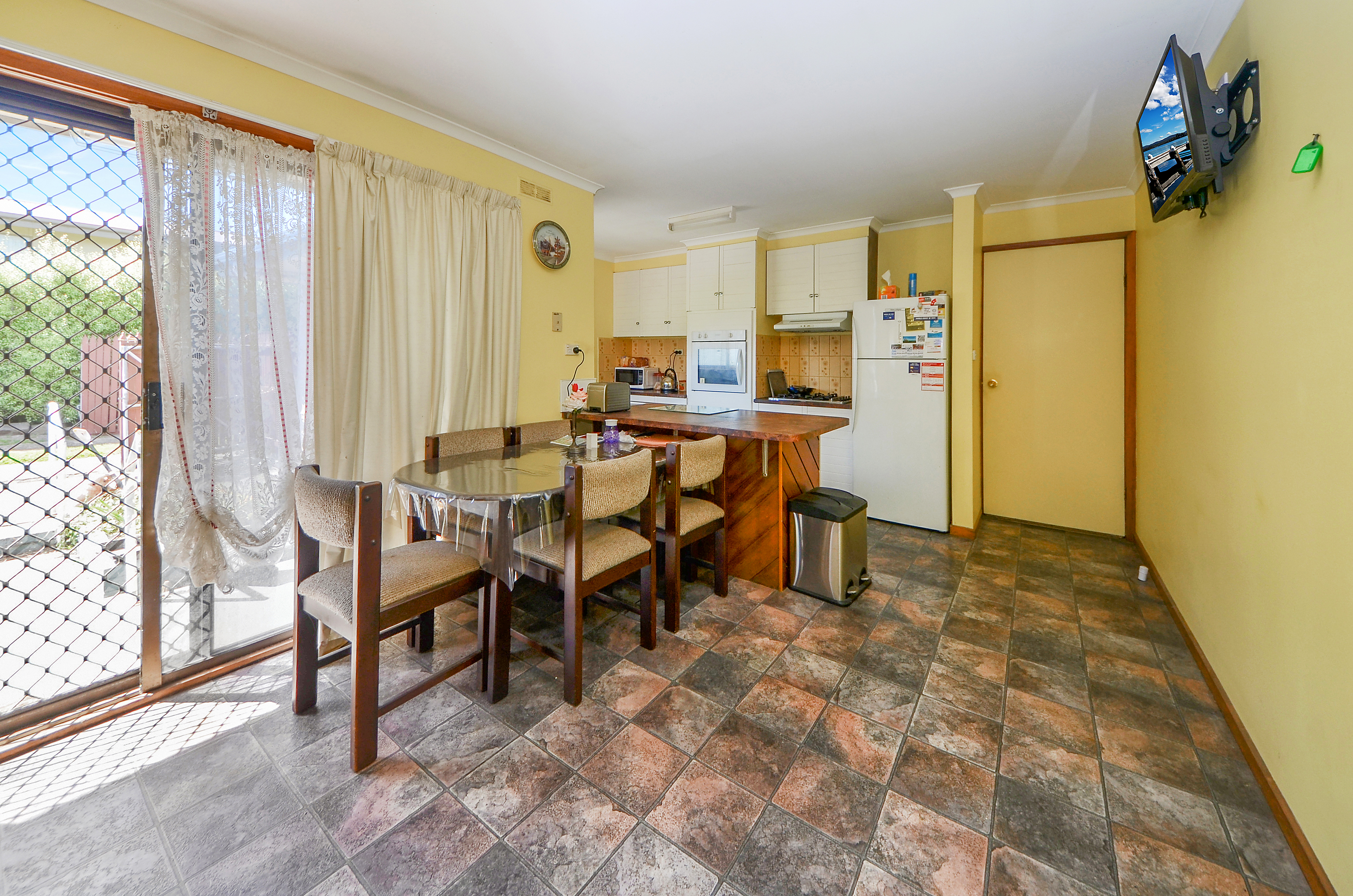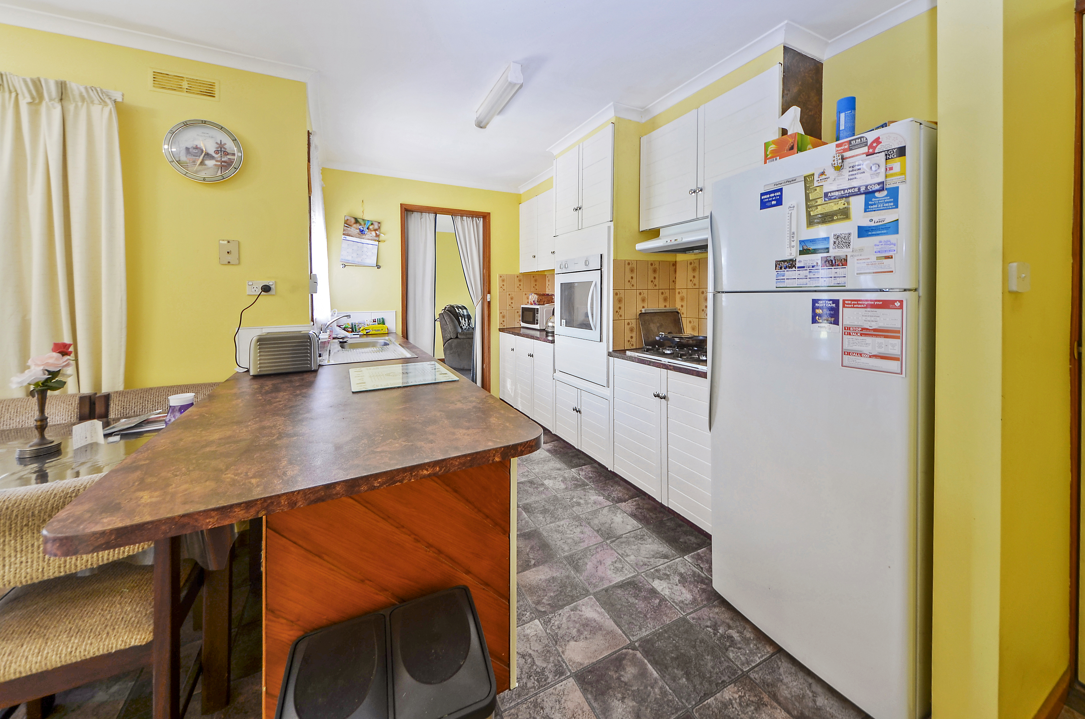 This neat residence includes a galley kitchen with built-in wall oven, gas hotplates and updated cabinetry. There is a breakfast bar at one end of the kitchen conveniently joining the kitchen to the dining area, which has direct access to a north-facing sun-filled patio. At the opposite end of the kitchen is the separate formal lounge complete with carpet and gas heating. The three bedrooms, each have built-in robes, and the family bathroom includes bath, shower, vanity and separate toilet.