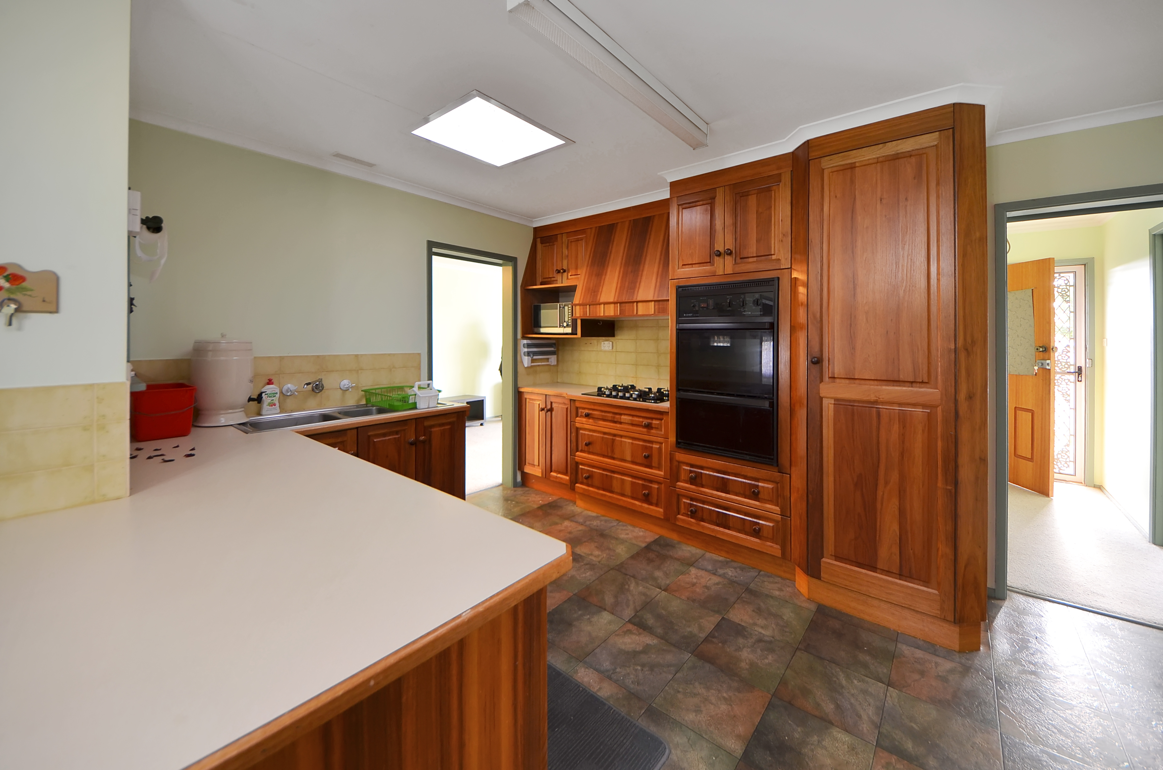 The rich timber kitchen is a welcoming space with a large breakfast bar for meal preparation, gas cooktop, electric wall oven, dishwasher and floor to ceiling pantry. There is direct access to the front L shaped lounge from the kitchen and from the dining area just a step down into the 2nd living area and then out to the large enclosed entertaining area.